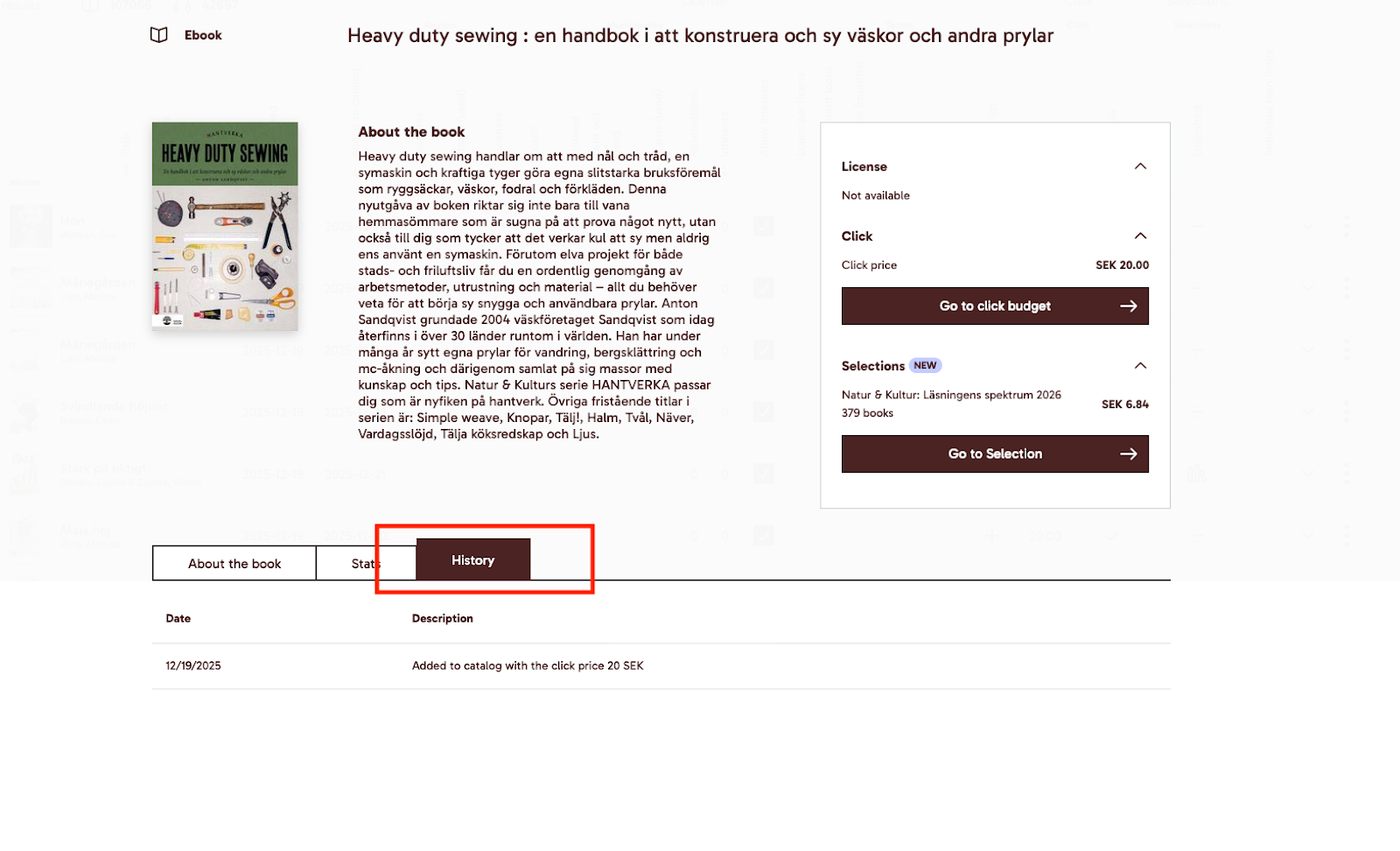 När du tittar på den specifika titeln har du nu en flik som heter ”Historik” där du kan se när titeln lades till i katalogen, om några prisändringar har gjorts eller andra ändringar i bokens metadata.