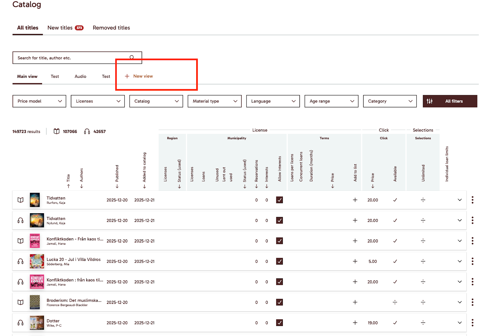 Det har lagts till en funktion för att spara vyer med specifika filter under ”Alla titlar” i katalogen.